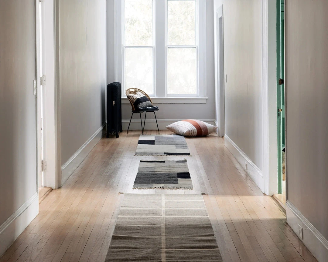 The Element Wool Rug brings balance to a room with its grounded, rectangular shapes that seem to fit together like a puzzle. The Rain option provides a more playful color palette that reminds us of an afternoon stroll after rainfall, when everything is glistening and serene. The Charcoal colorway reminds us of shadows cast on sidewalks by midday light