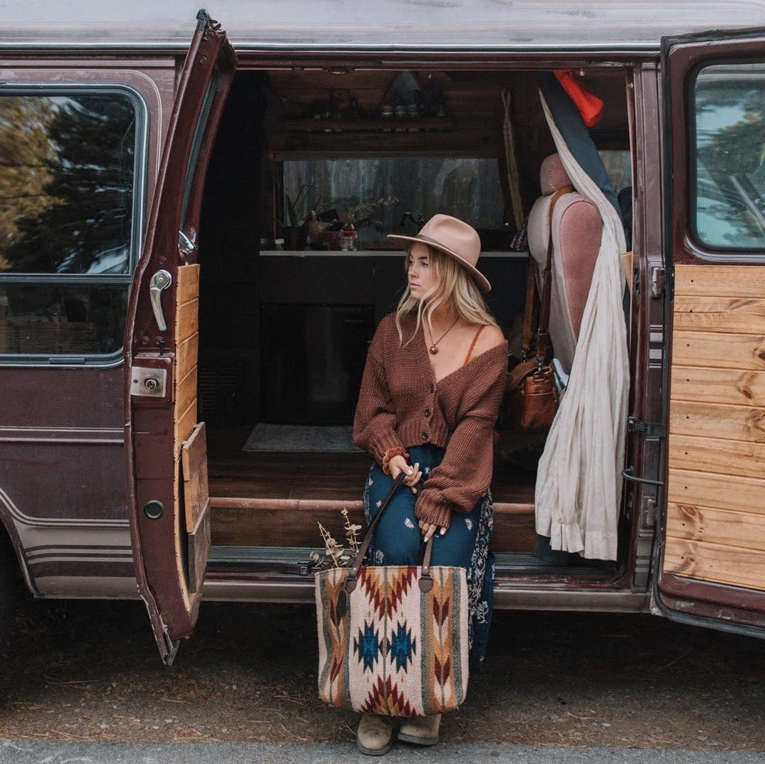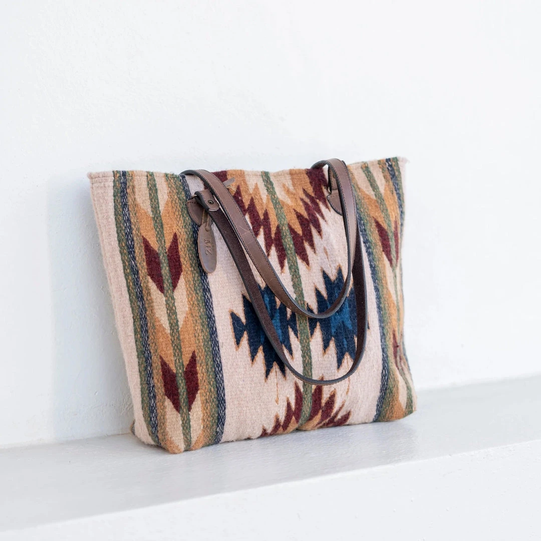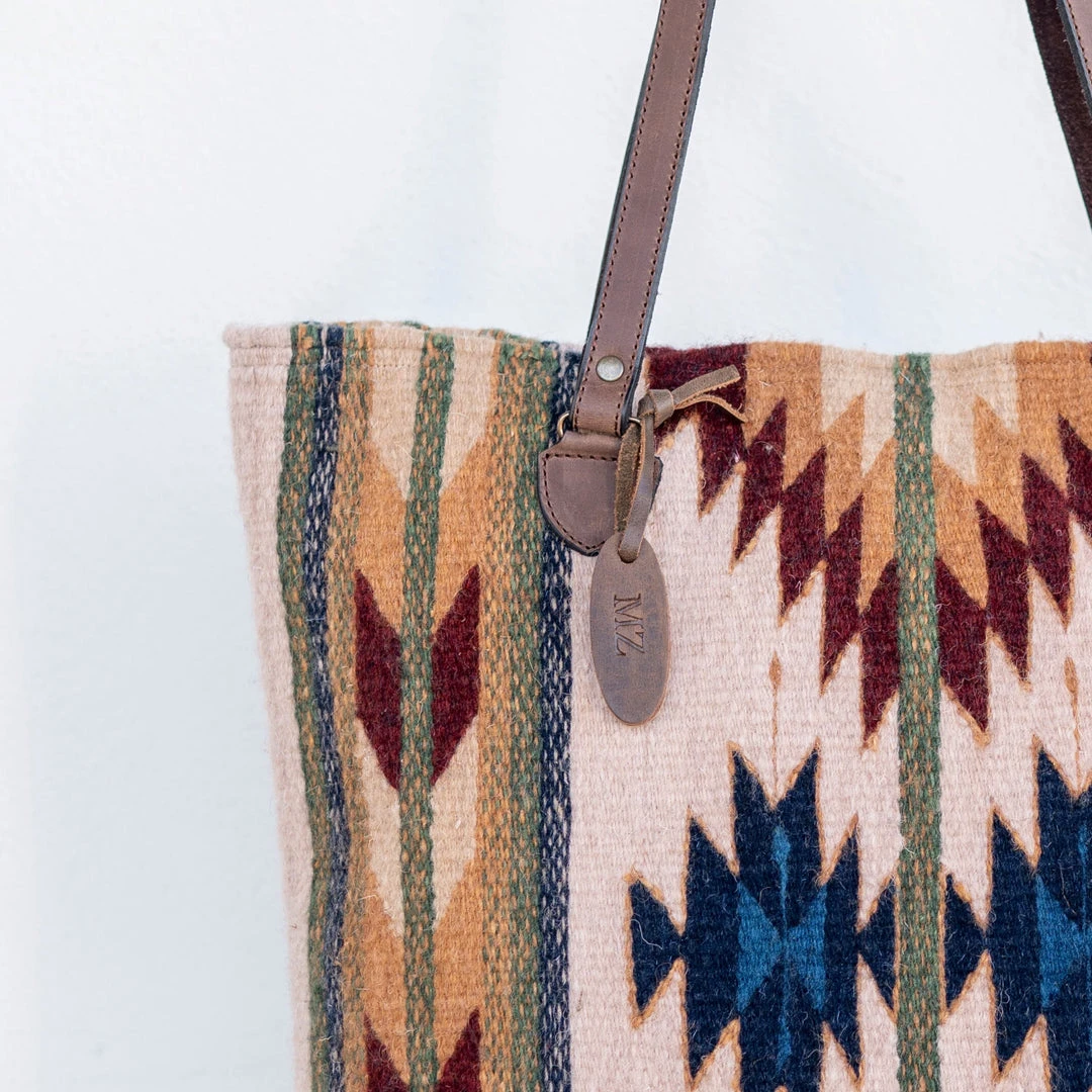 The Gemini pattern features an intricate design of Zapotec diamonds, arrows and butterflies in earthy shades of beige, rust and mustard with a pop of cobalt and royal blue.