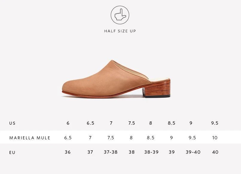 It’s recommended to size up a half size unless you have narrow feet. After a few wears, these mules should soften up so that it becomes easier for your toes to slip in all the way to the end.