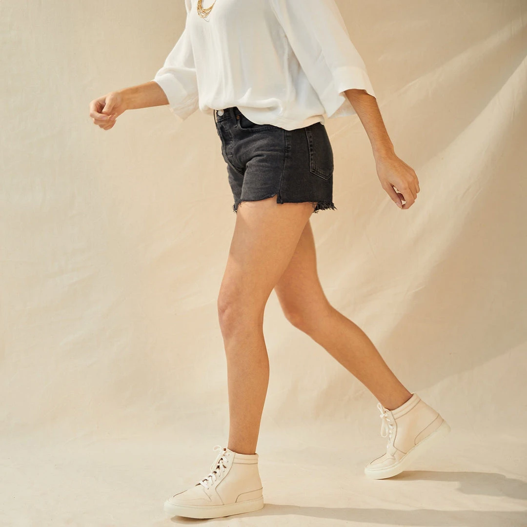 The Reina High Top Sneaker is a nod to classic skate styles elevated by sophisticated leathers. Dress up your favorite pair of jeans or make a cool casual statement with your go-to skirt. Perfect for walking California piers to the streets of Manhattan.
