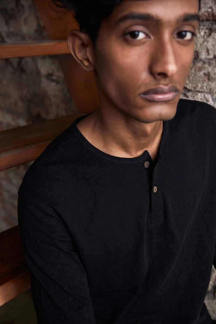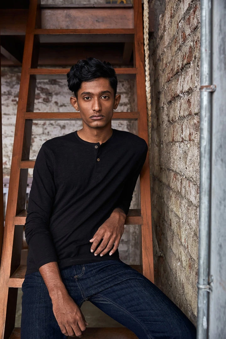 A classic henley cut in a slim fit, which can be stylish or nonchalant, depending on how you pair this lounge-y essential. The subtly textured slub fabric adds a distinctive touch, while the slightly wide neckline complements its athletic fit. Finished with coconut shell buttons.
