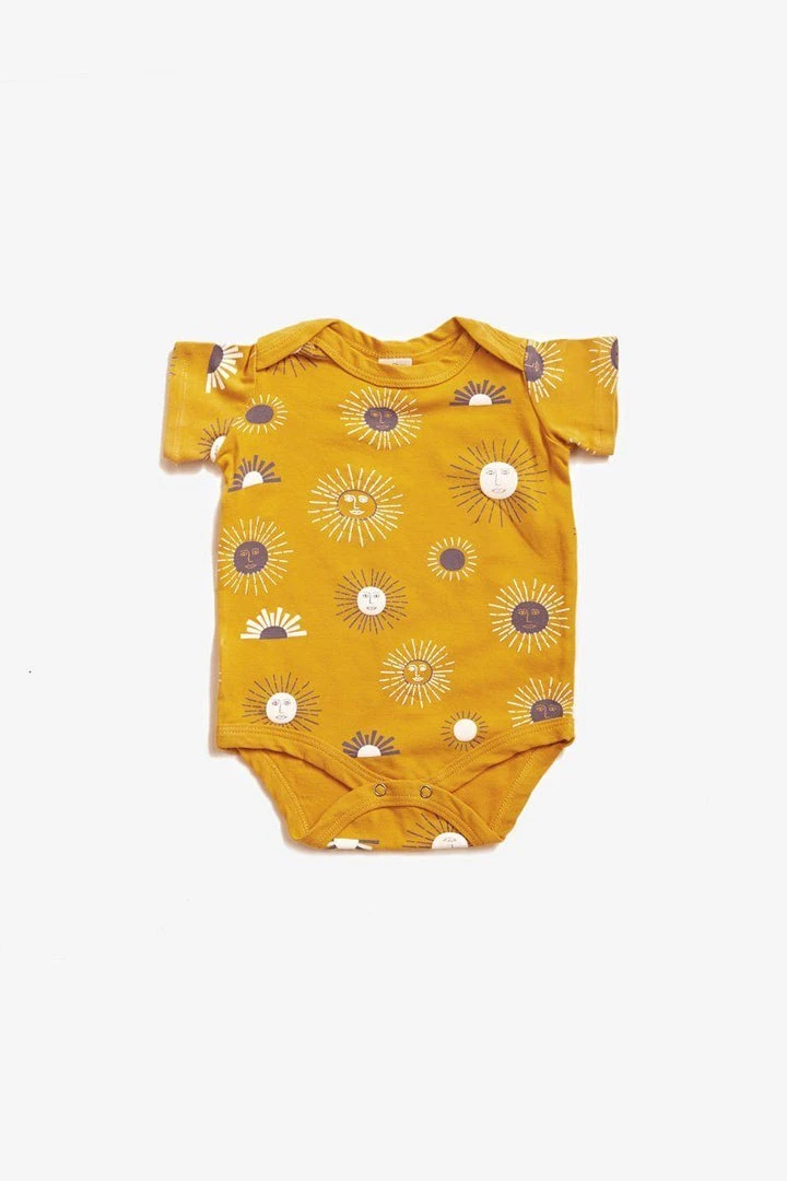 Super soft organic short sleeve onesie, all overprinted in the Suns print. Envelope neckline and a two snap closure for easy baby changing.
