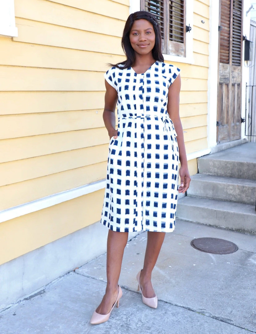 The mid-length Fiona button up dress features dreamy navy blue hues, cap sleeves, pockets and a fabric belt. A chic addition to your closet to take your through your day. Due to the handmade nature of these products there may be a 5-10% shade variation from the picture of the garment to the actual product you receive.