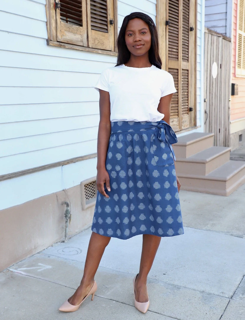 The navy blue and white midi Esmeray pocket skirt is handmade with ikat woven cotton and features ties at the back and pockets in the front. This patterned midi pairs perfectly with solid tops, sneakers or heels and complements all ages. Due to the handmade nature of these products there may be a 5-10% shade variation from the picture of the garment to the actual product you receive.