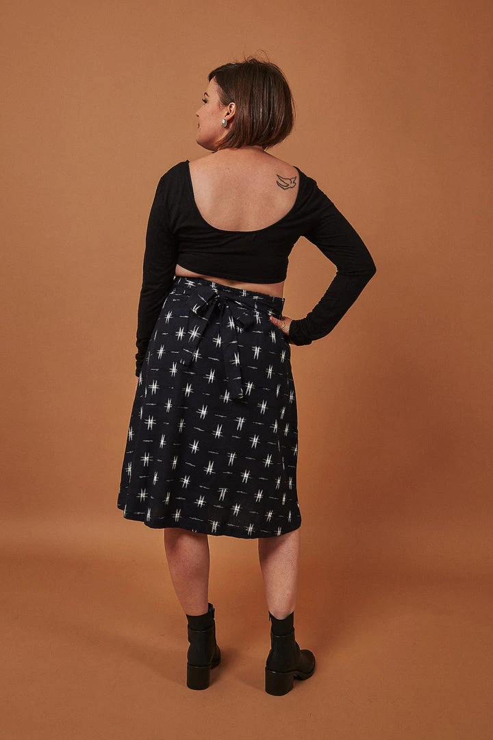 Three words to describe this handwoven star print: classic, vintage, versatile. This navy midi skirt has pockets and a wide waistband front and elastic back. Skirt falls at or above the knees, which creates an effortless look of elegance and poise. Your purchase helps provide a secure job with fair wages and a positive working environment to artisans in India and the United States.