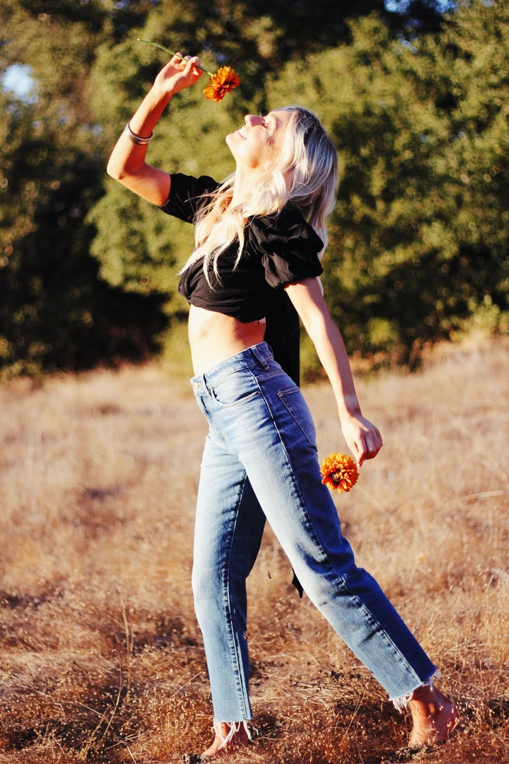 This high rise straight is modernized with comfort stretch, a high rise contour waistband, and Porter Blue’s iconic sun embroidered on the wearer’s back pocket. The hem is cut raw and the inseam hits above the ankle bone at the 7/8” length. Will vary depending on height.