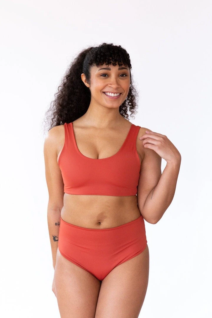 The Nina bottoms are high waisted but still show a little cheek. ECONYL is made by rescuing waste such as fishing nets, used carpets, and fabric scraps from landfills and oceans around the world. It is processed into yarn and woven into this sustainable fabric.