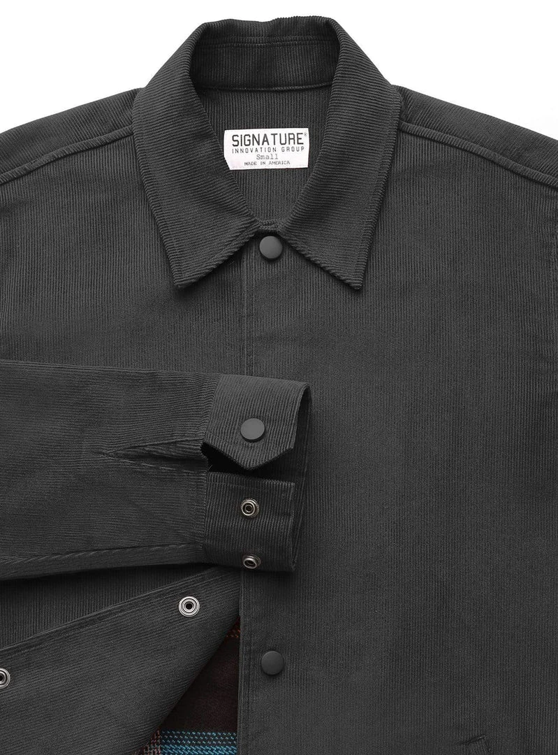 This corduroy jacket is a lightweight piece that’s perfect for layering. The cuffs feature an arrow-cut design that compliments the eye catching, color-matching snaps. The outside has two flat laying welt pockets. The inside seams have been finished and closed with chambray trim. Throw it on over jeans and a tee to create an elevated look.Â