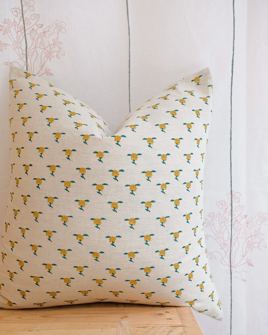 The Rhea Throw Pillow is hand block printed by artisans in a small village outside of Jaipur. The bright, joyful design is inspired by the romance and poetic feel of Udaipur. Subtle nuances are to be expected with handcrafted textiles.