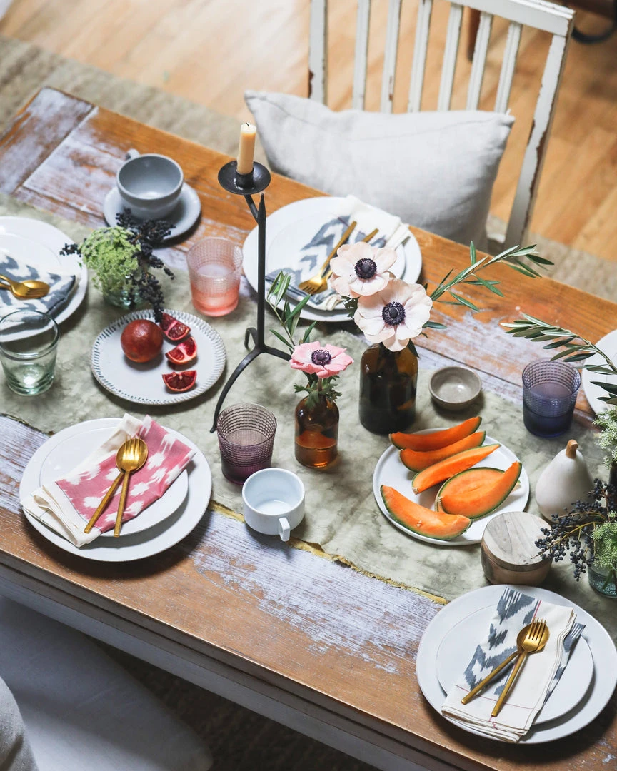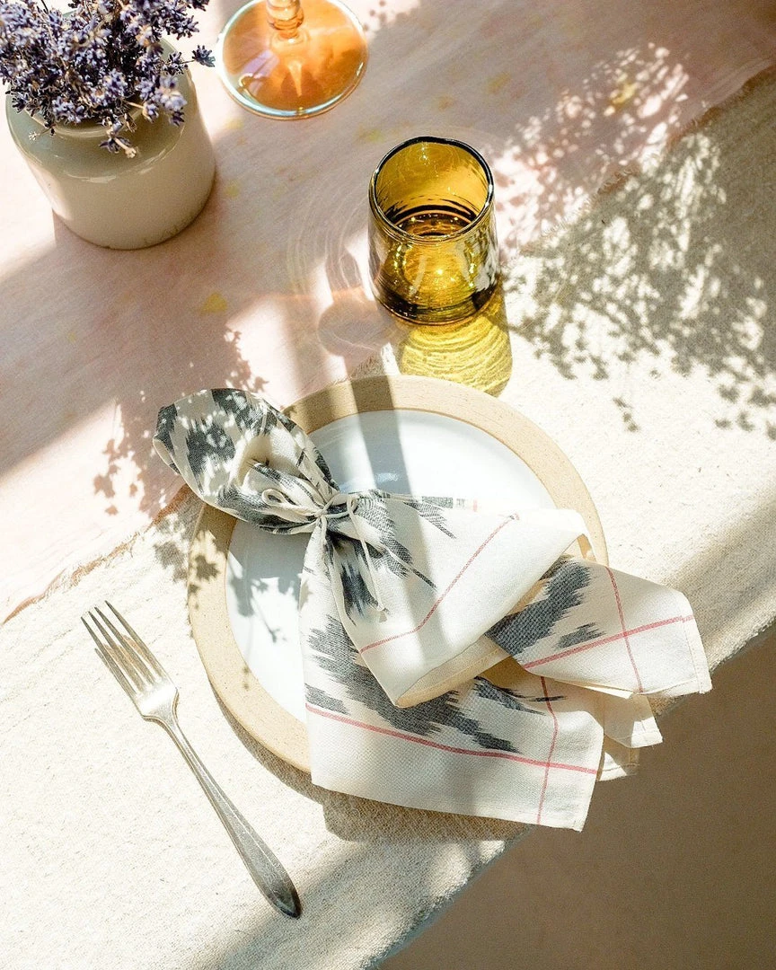 Add artisanal textiles to your tabletop with the Ruhi Handwoven Ikat Napkins. Made with the intricate craft of handloom Ikat weaving, these table napkins will bring vibrancy and color to any tablescape. These napkins are entirely hand-crafted pieces; slight nuances are the signature of the human hand.
