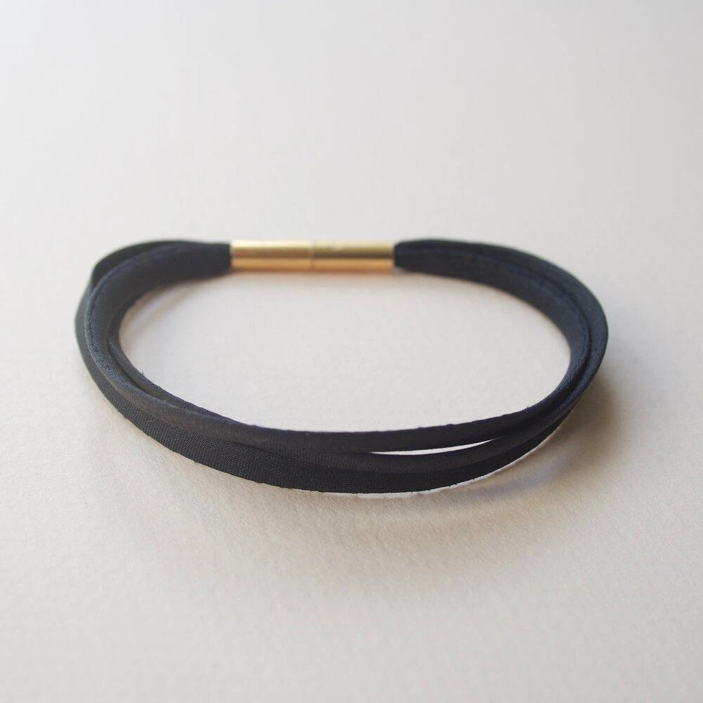 Delicate silken strands encircle the wrist as a bracelet or connect to create a necklace of multiple lengths. This style is modular, multiple bracelets can be connected (via magnets in bracelet’s closure) to create a necklace of infinite length. All colors (with the exception of Ebony) are achieved via botanical dyes. Due to the hand-dyed nature of this piece, slight variations in color are to be expected.