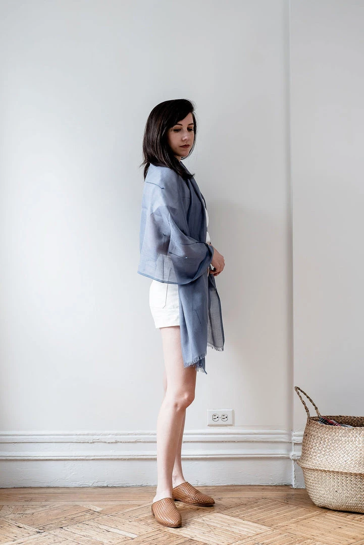 Minimal design elements are beautifully handwoven to create this translucent scarf. This hand woven scarf is made by artisan weavers in Nepal. Each piece comes with an individual envelope shaped pouch made with canvas cotton and a natural wood buttoned closure. This ensures a longer life for the scarf.