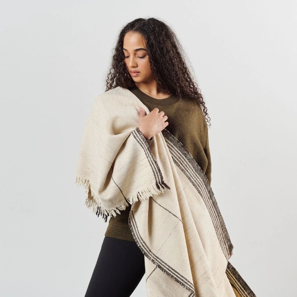 The Seytu Throw is a slightly textured handwoven throw with skillfully blended handspun silk, wool and organic cotton yarns that are left undyed. This classic design is hand washed in a special way so that the texture of the natural yarn becomes its own design element. Seytu means a bridge in Hindi language and we see this textile as bridge between heritage craftsmanship, sustainable materials and classic design.Â