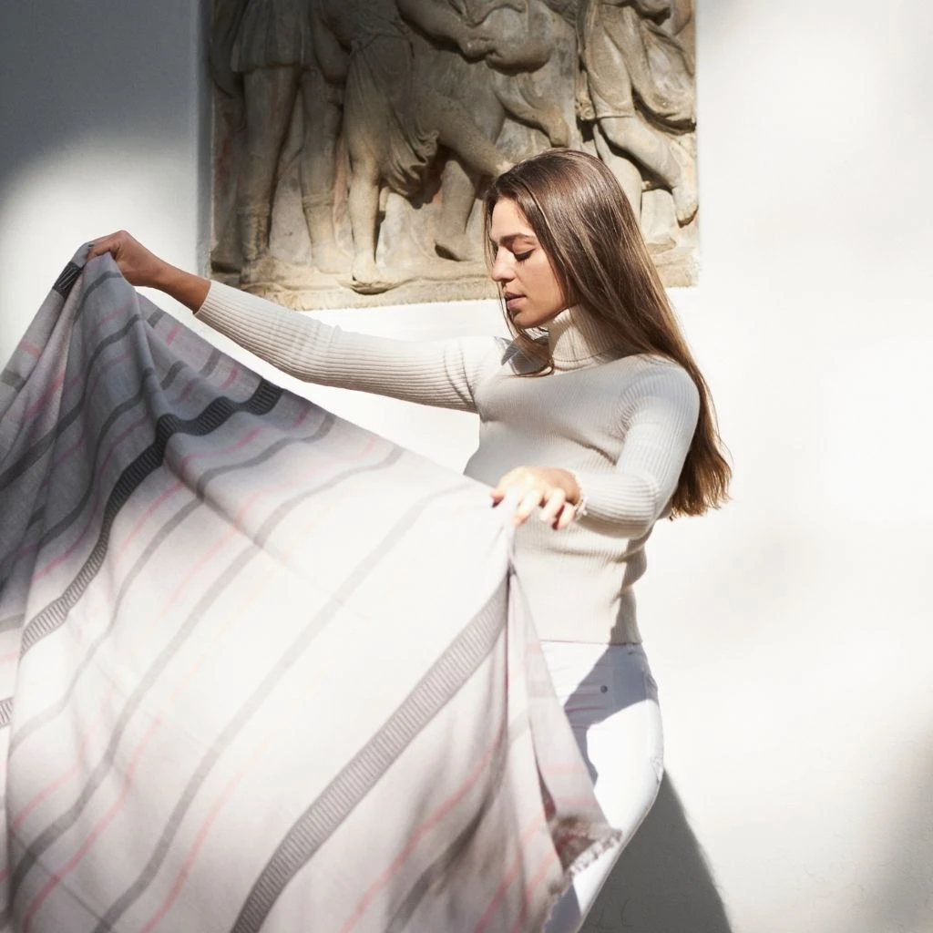 The Pewter Throw is a classic design made up of handwoven checks pattern with beautiful handwoven motif border in shades of soft sage, beige and white (undyed organic cotton yarn). The organic cotton used is cultivated using rain water harvesting process. As this luxurious textile is completely handmade from start to finish, each piece is unique. Classic and modern in design, this timeless throw / blanket will enhance interior spaces and also support artisan communities.