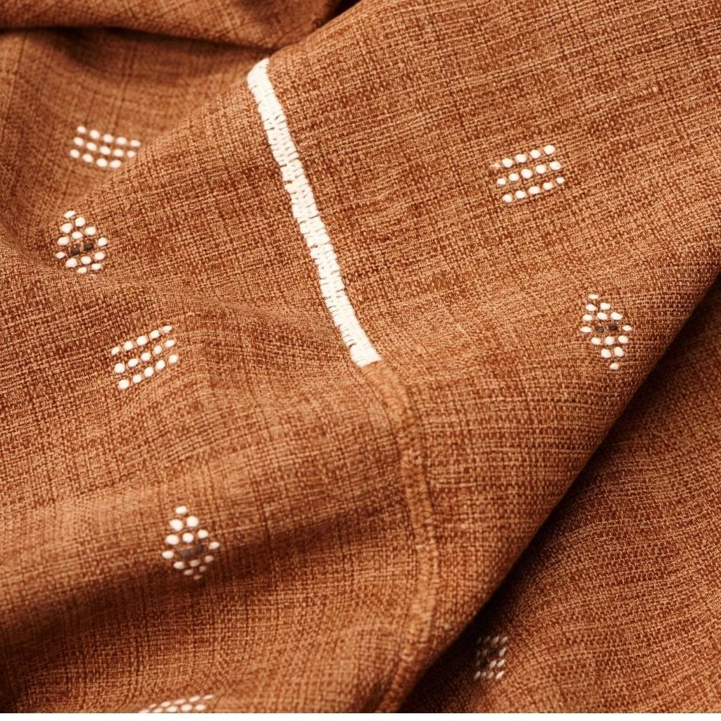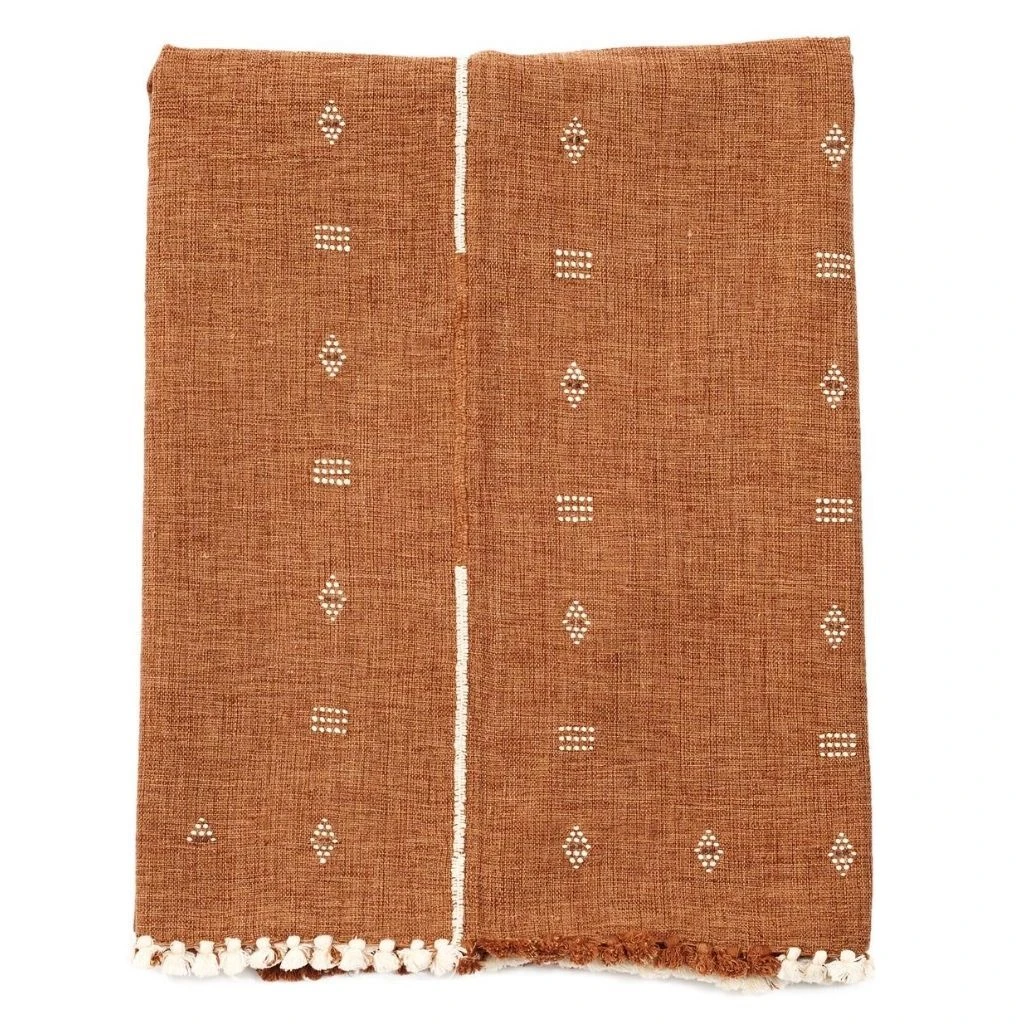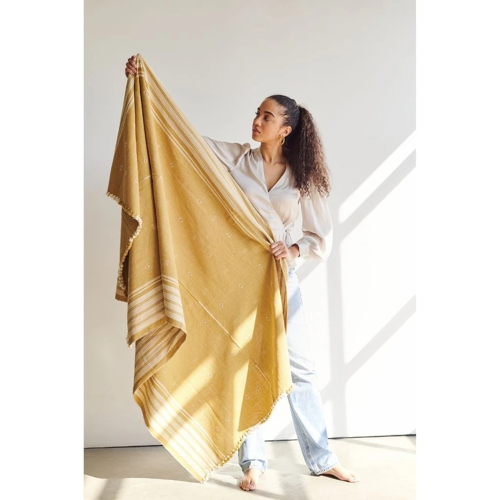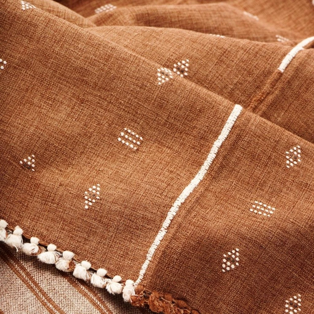 The Reyti is an organic cotton blanket, woven using an ancient hand-looming technique that originated in the western part of India. Reyti means mud or sand in Hindi. The edges are hand-rolled and the design is hand-embroidered. It takes an incredibly skillful master artisan to make this special piece.