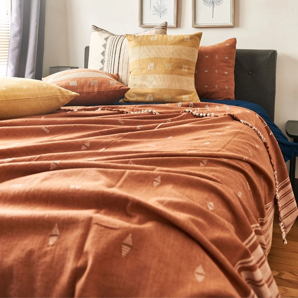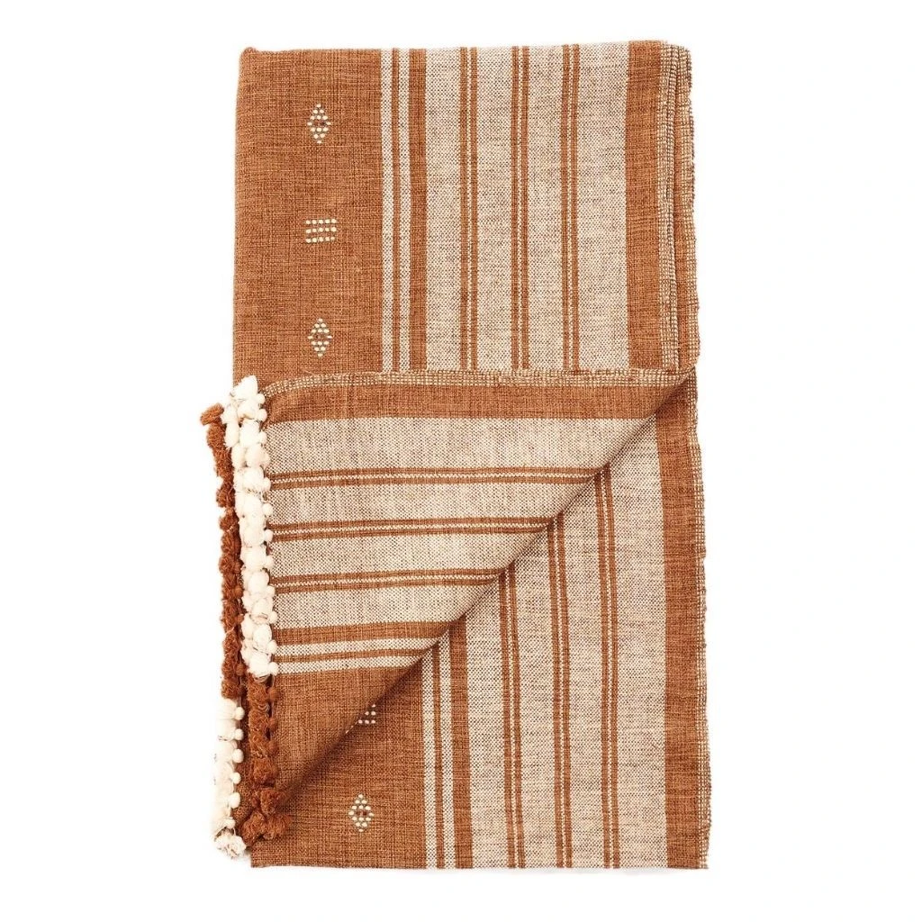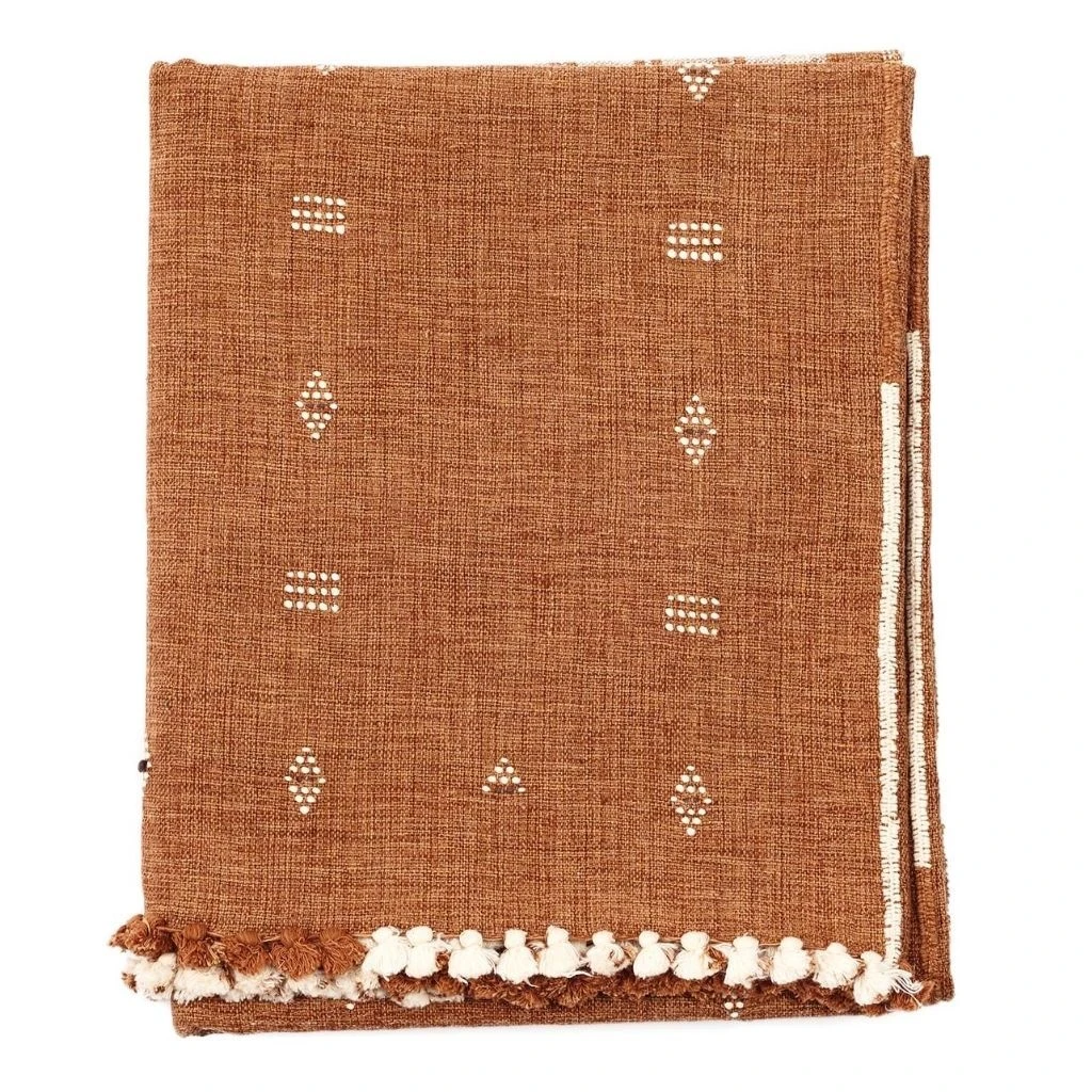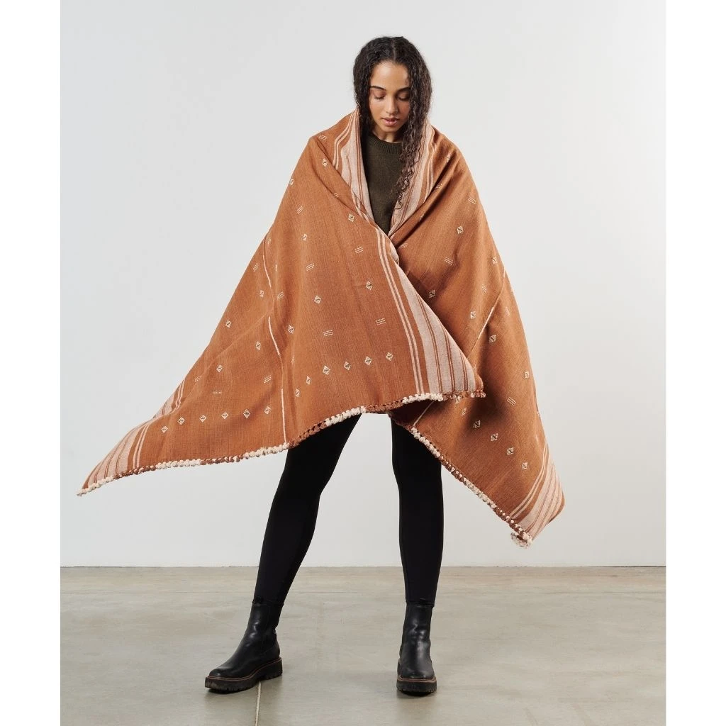 The Reyti is an organic cotton blanket, woven using an ancient hand-looming technique that originated in the western part of India. Reyti means mud or sand in Hindi. The edges are hand-rolled and the design is hand-embroidered. It takes an incredibly skillful master artisan to make this special piece.