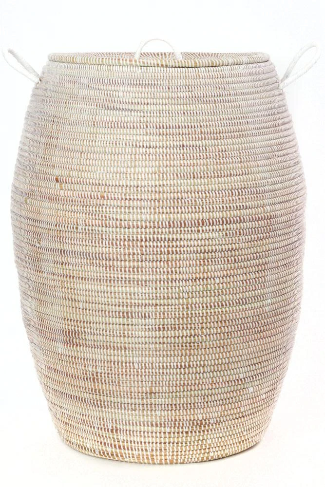 These laundry hampers are handwoven by more than 100 rural Wolof women. Crafting baskets allows women to earn income from the comfort of their community. Using abundant and renewable cattail stalks bound with salvaged plastic strips procured from a local mat factory, the women hand-weave each of these hampers. These handcrafted baskets may vary slightly as compared to the the photos, as each set is unique.