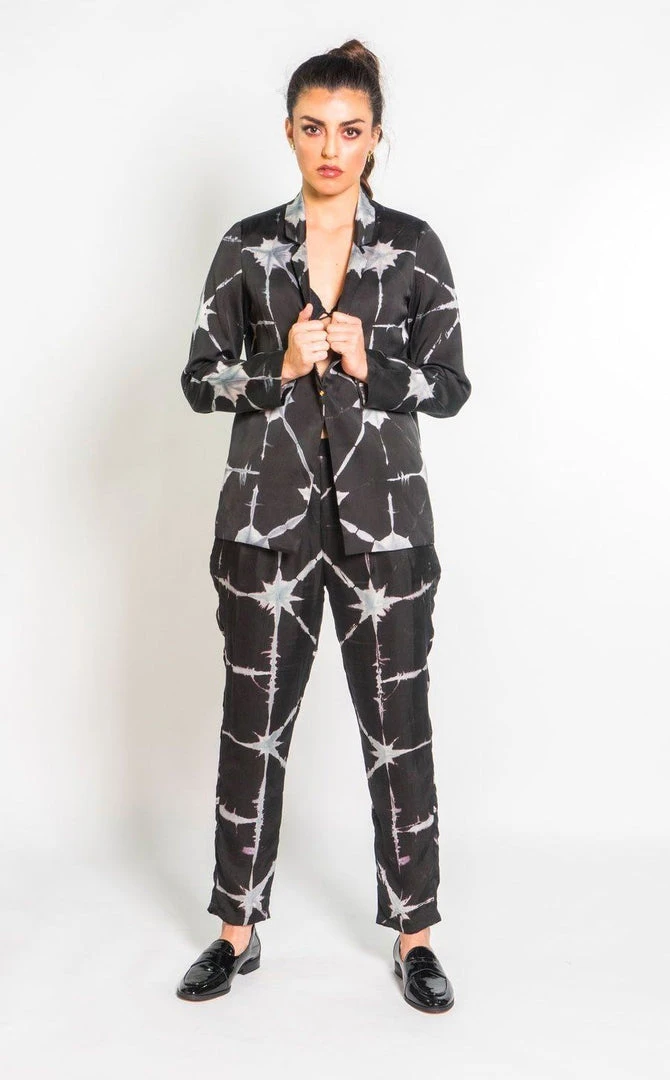This silk suit is hand-dyed dyed using an origami-inspired pattern to create triangular shapes. Now you can bring your boho spirit to work with sophistication.