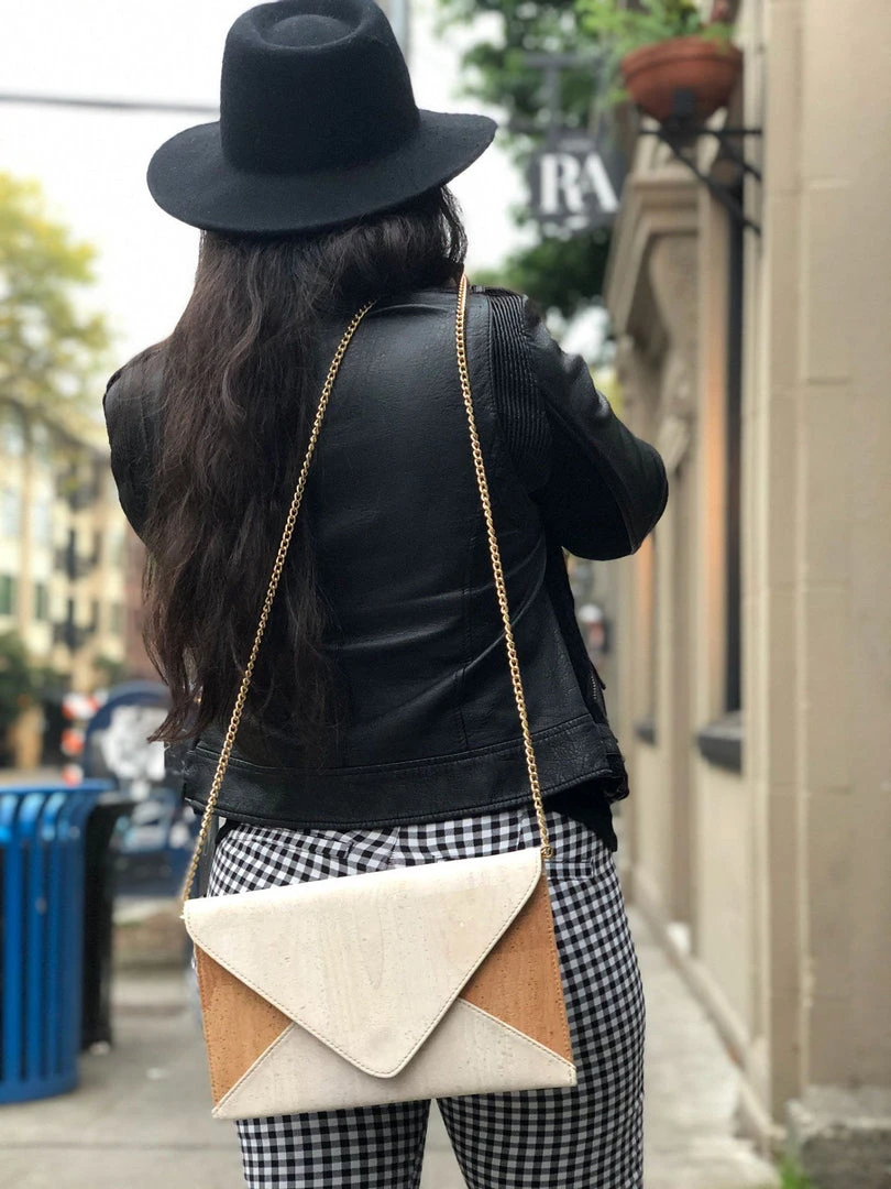 Functional for daytime adventure and chic for night time fun. This lightweight, versatile bag is surprisingly large and features an adjustable chain, interior zipper pockets, and magnetic enclosure Use this as a shoulder bag, crossbody bag or a clutch by tucking in or removing the chain. Made from vegan, hypoallergenic, antimicrobial, waterproof, lightweight, durable, biodegradable and recyclable natural cork.