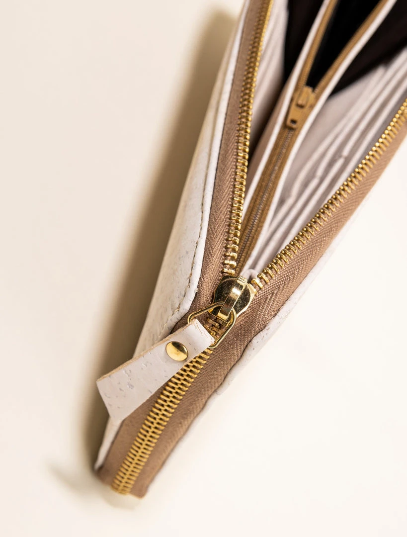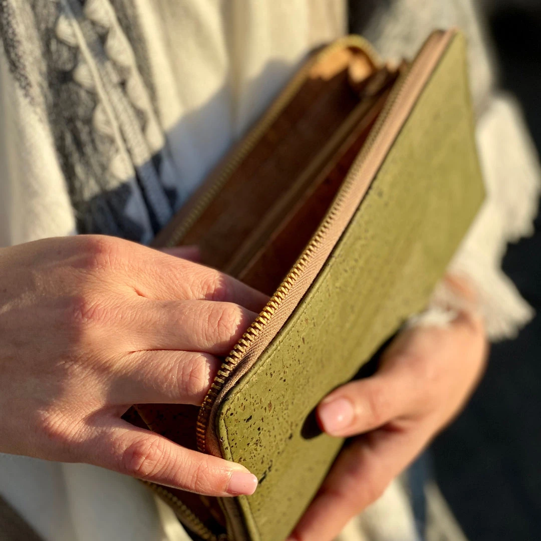 The Just Right Wallet is a spacious, classic style with a pocket for everything you might need. Featuring an open interior compartment, two inside flat pockets, twelve card slots, an interior zipped coin pocket, and a full zipped closure, this wallet will keep your valuable secure and organized. Made from vegan, hypoallergenic, antimicrobial, waterproof, lightweight, durable, biodegradable and recyclable natural cork.