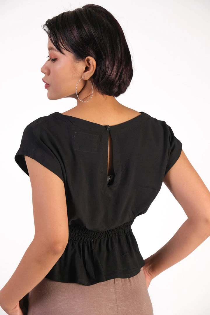 Offering femme summertime vibes with cinched waist and ruffled hem, this lightweight top is made using reclaimed rayon as part of tonlé’s sustainable zero waste process. Pair with your favorite bottoms and accessorize at will for easy breezy style.