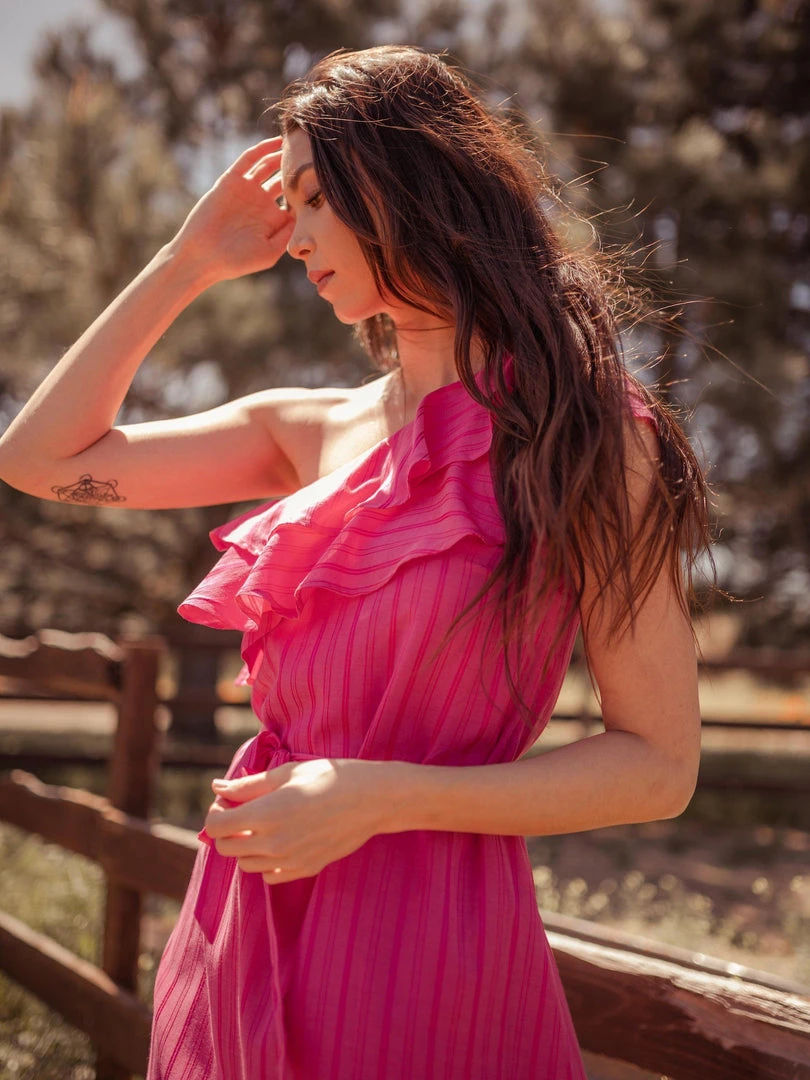 The Sokha Banana Midi Dress is sure to become your favorite sundress. Sokha is all about movement with a relaxed A-line silhouette, asymmetrical neckline, and double flounce ruffle detail. The optional tie at the waist lets you style it with both a strait and cinched waist. Sokha is made from banana viscose, a vegan alternative to silk that comes from discarded banana tree stems. This material is soft and breathable, keeping you cool throughout the warm months. Read about how banana fabric is made on Made Trade Magazine.