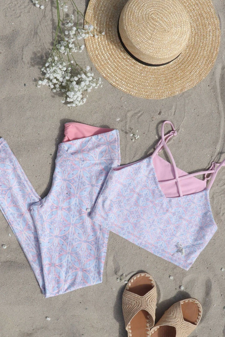 This reversible, midlength tank features adjustable shoulder straps and a sultry, front-facing crisscross design. With a nod to Spanish architecture, Riviera features an ornate portico-like print with a pop of coral.