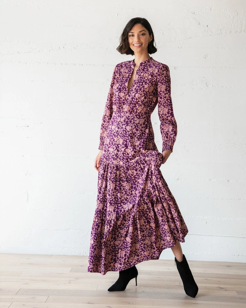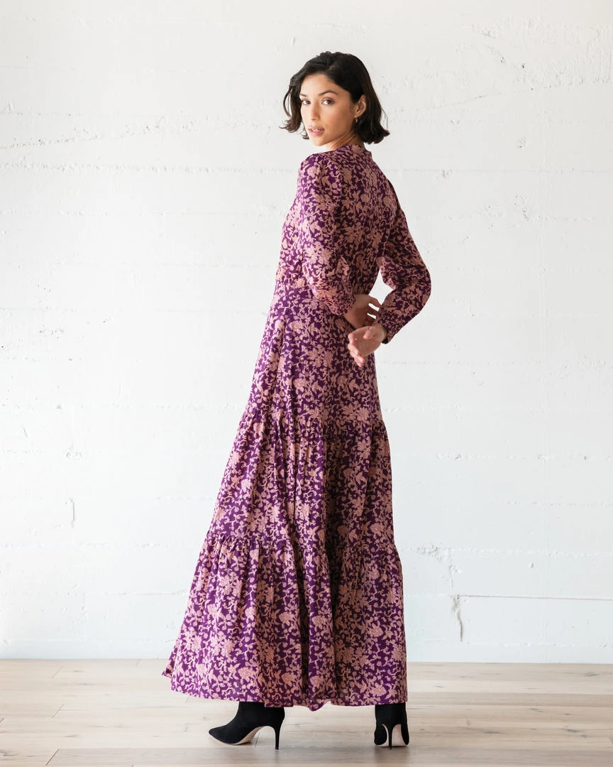 A fresh palate and an aura of vintage Victorian elegance – traits that define the Chester Dress. A hand-stamped block-print pattern decorates rich plum cotton, fitted through the bodice with a billowing tiered maxi and notched V at the collar. With immaculate tailoring and impeccable craftsmanship, it is an unforgettable old-meets-new icon.