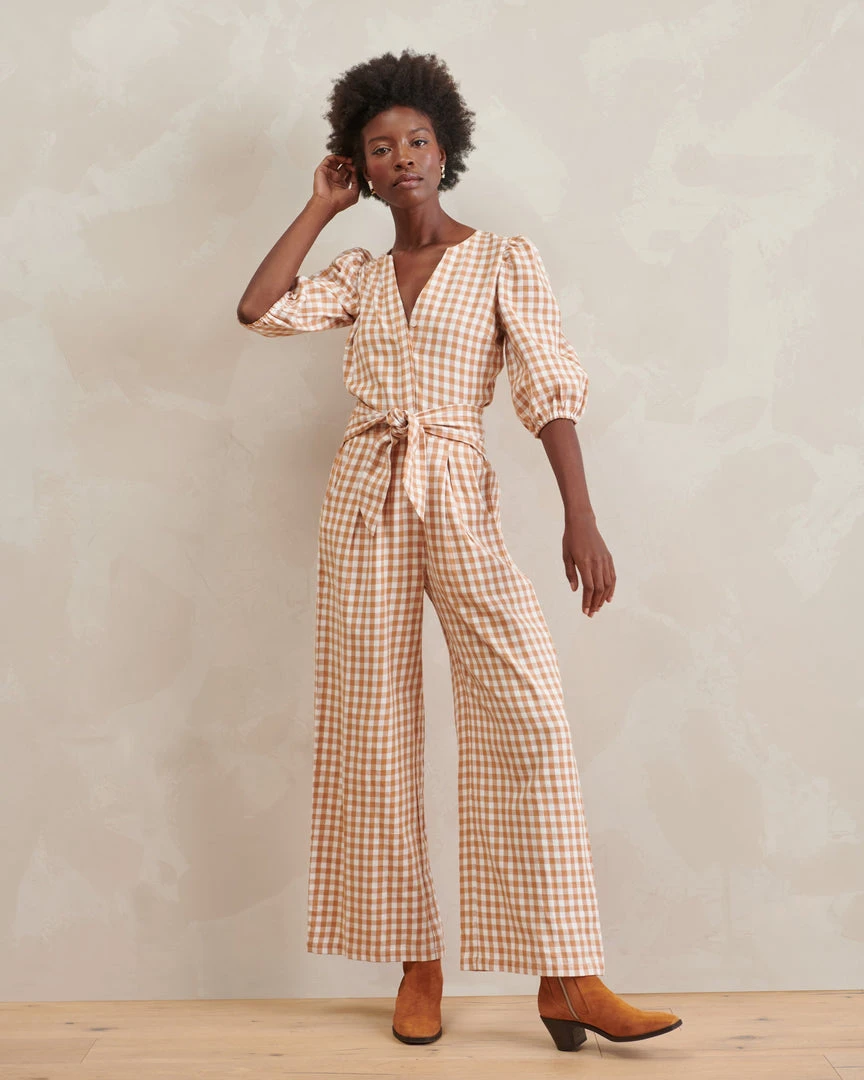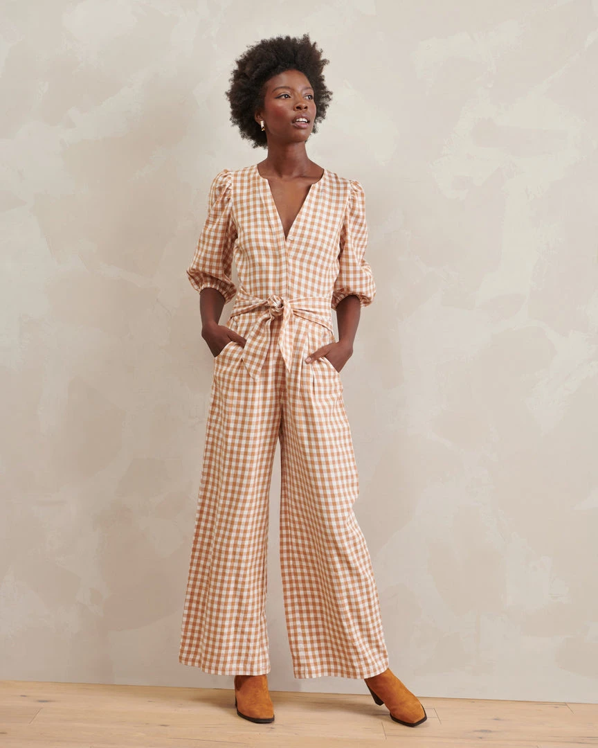 The Amber jumpsuit is a breezy Gingham jumpsuit with clean lines a sleek details, featuring a front tie belt at the waist and subtle feminine puff-sleeve detailing. Made of ultra-fine 100% organic cotton — a minimalist design with maximum effect.