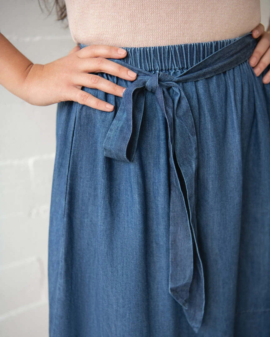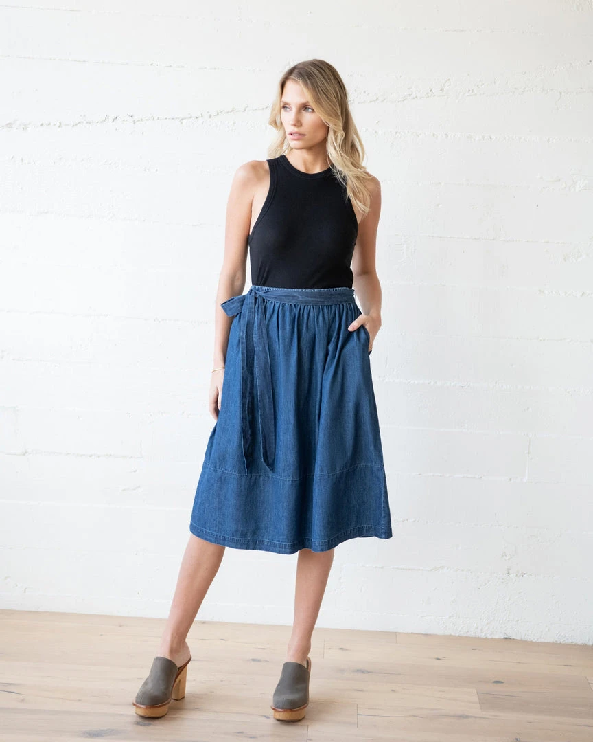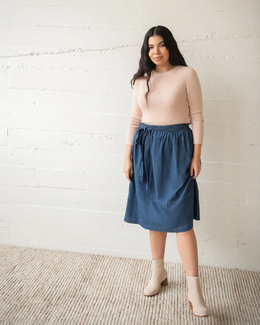The mid-length Nell Skirt falls just below the knee, in medium-washed cotton chambray denim. This A-line style is cinched at the waist with gathered elastic banding and a sash-style belted tie.
