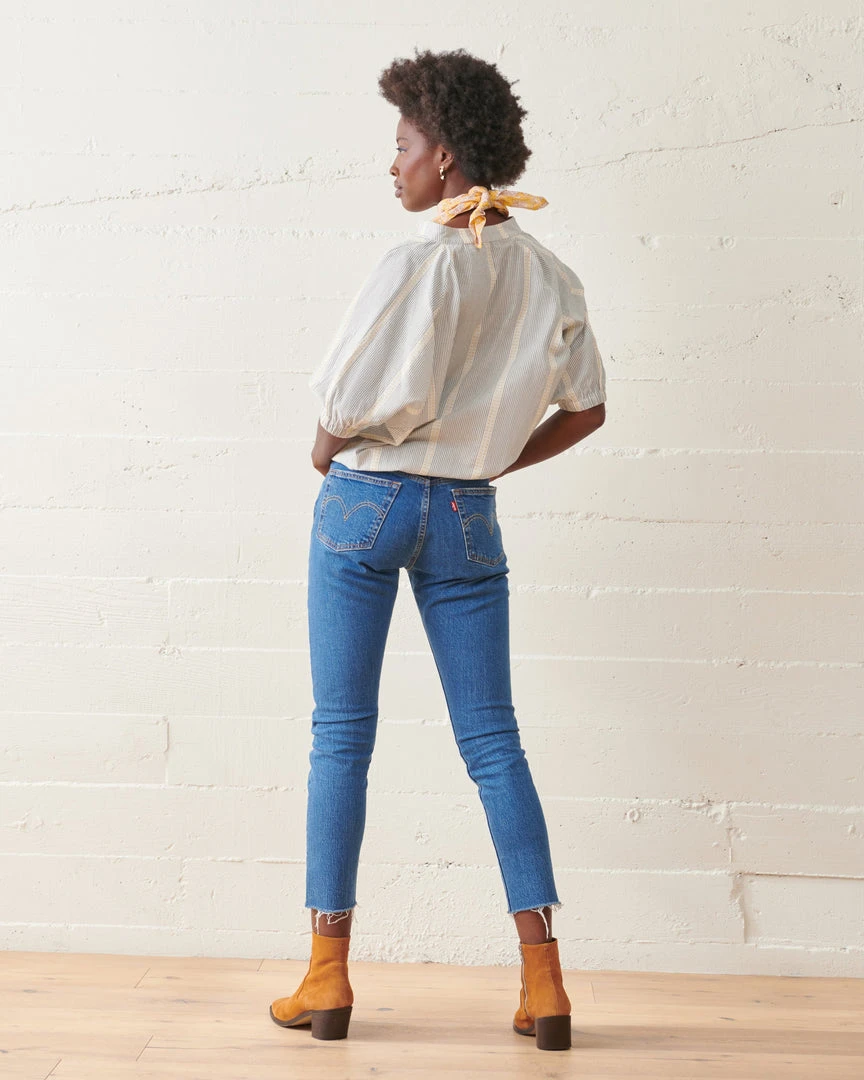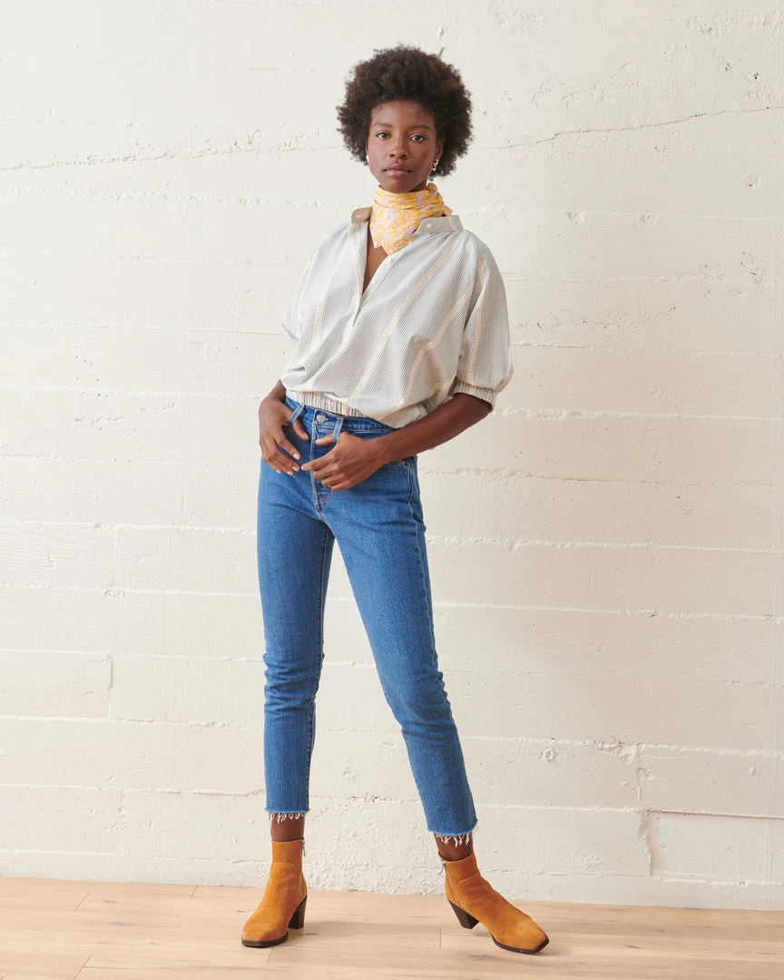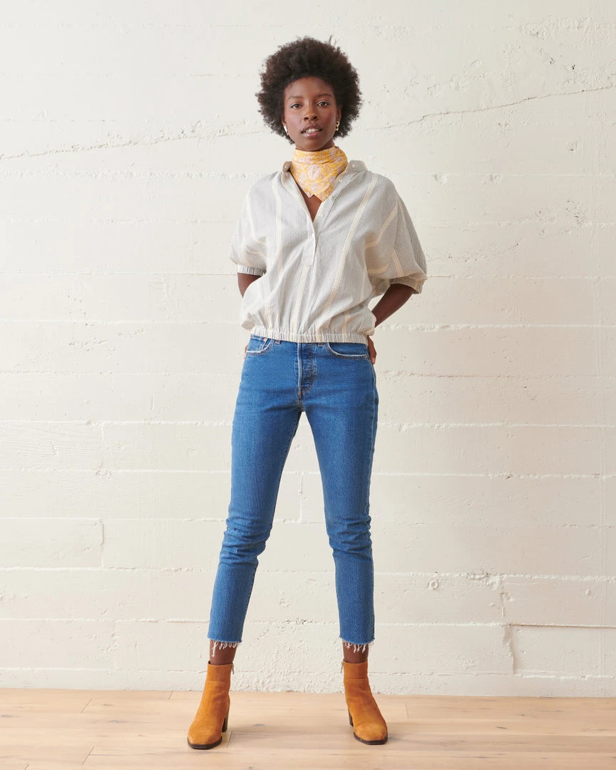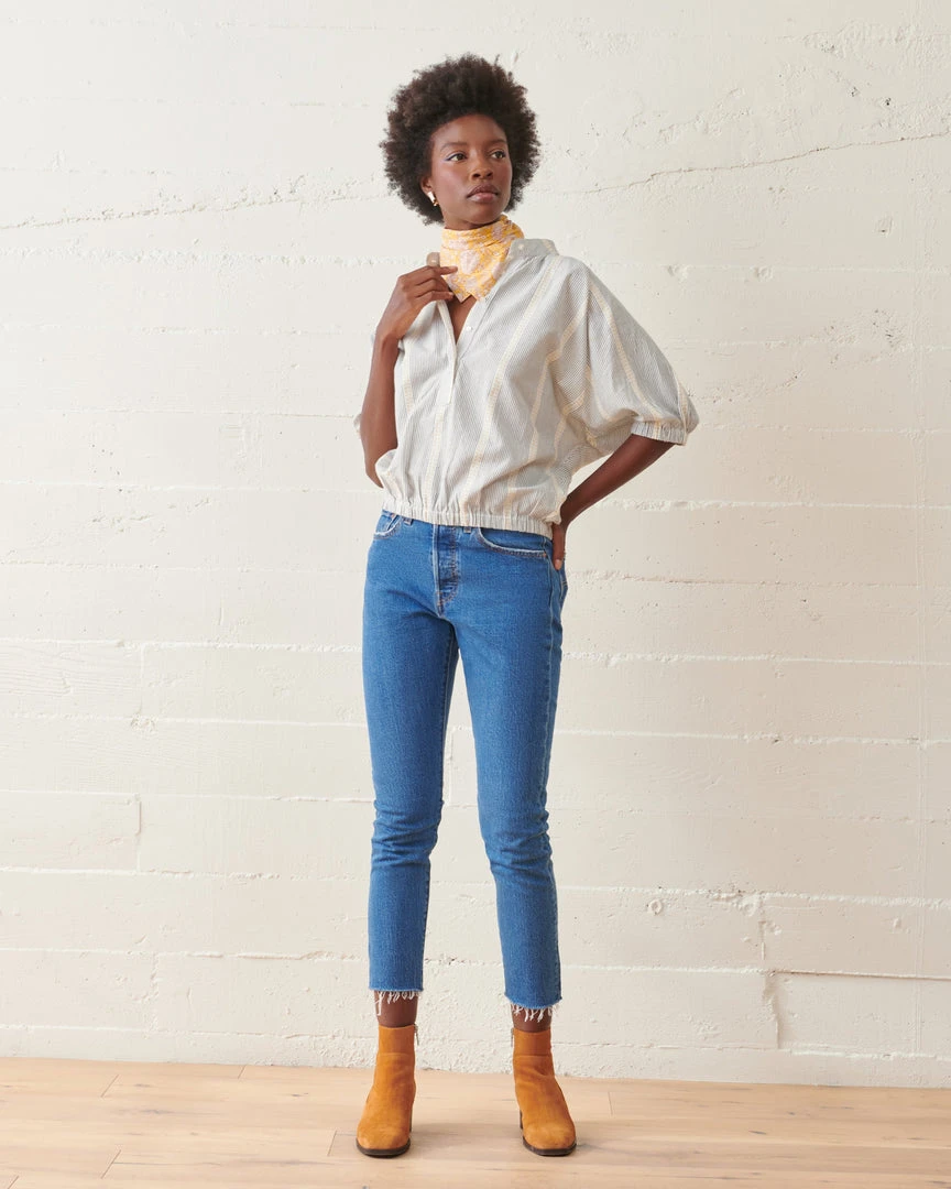 The Luca Striped Top exudes easy, chic style. Featuring a balanced blend of fitted and flowy, a cropped elastic waist and cuffs forms a subtle romantic billowing effect. Crafted from lightweight organic cotton jacquard stripe and finished with delicate shell buttons.