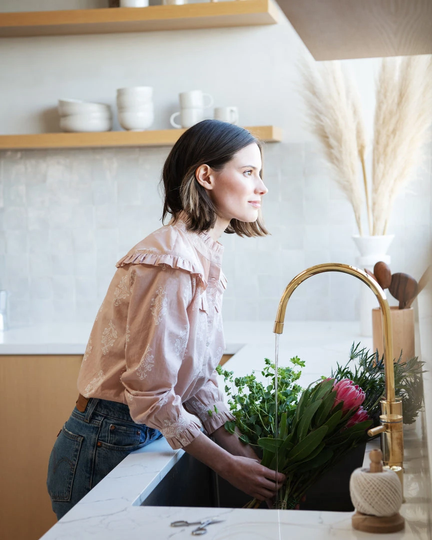 The Nicolette Top is hand-stamped, with block-print floral design and flirty ruffles at the collar.