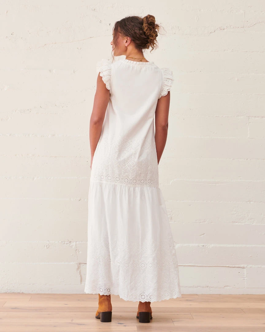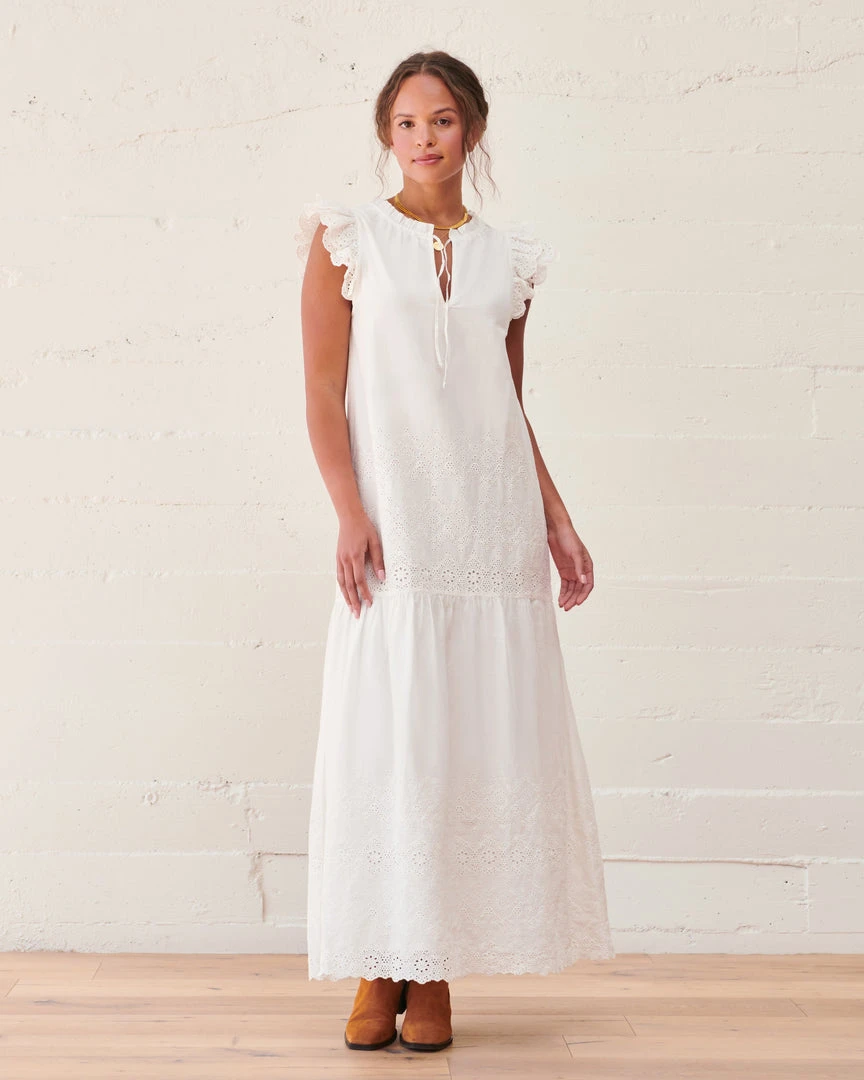 The organic cotton Palma Eyelet Dress is a classic, romantic summer dress featuring a cascading tiered maxi skirt, double layer flutter cuff sleeve, and finished with a charming tie at the neckline. Crafted from organic cotton for a lightweight effortless feel.