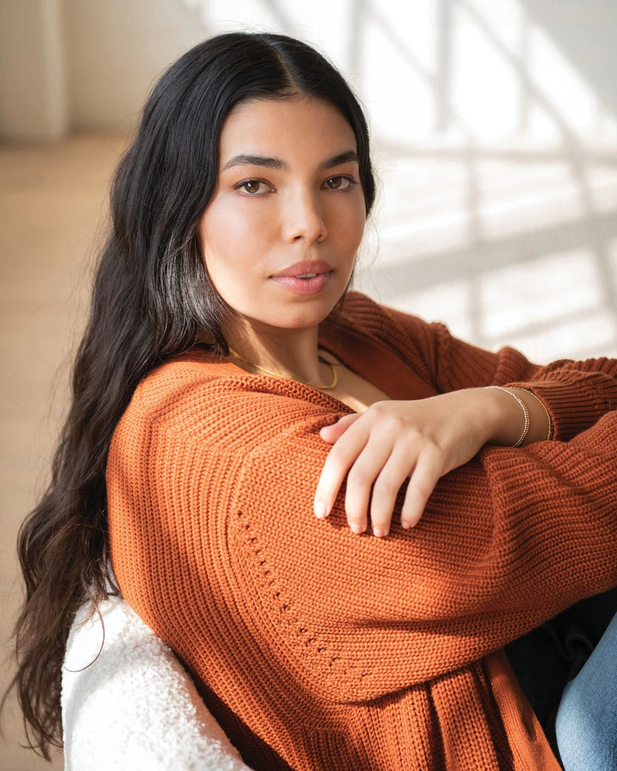 An oversized and gently draped button-front cardigan in a soft, wide-knit organic cotton and wool blend. This cold-weather must is effortlessly cool and always eco-friendly, with limitless styling possibilities.